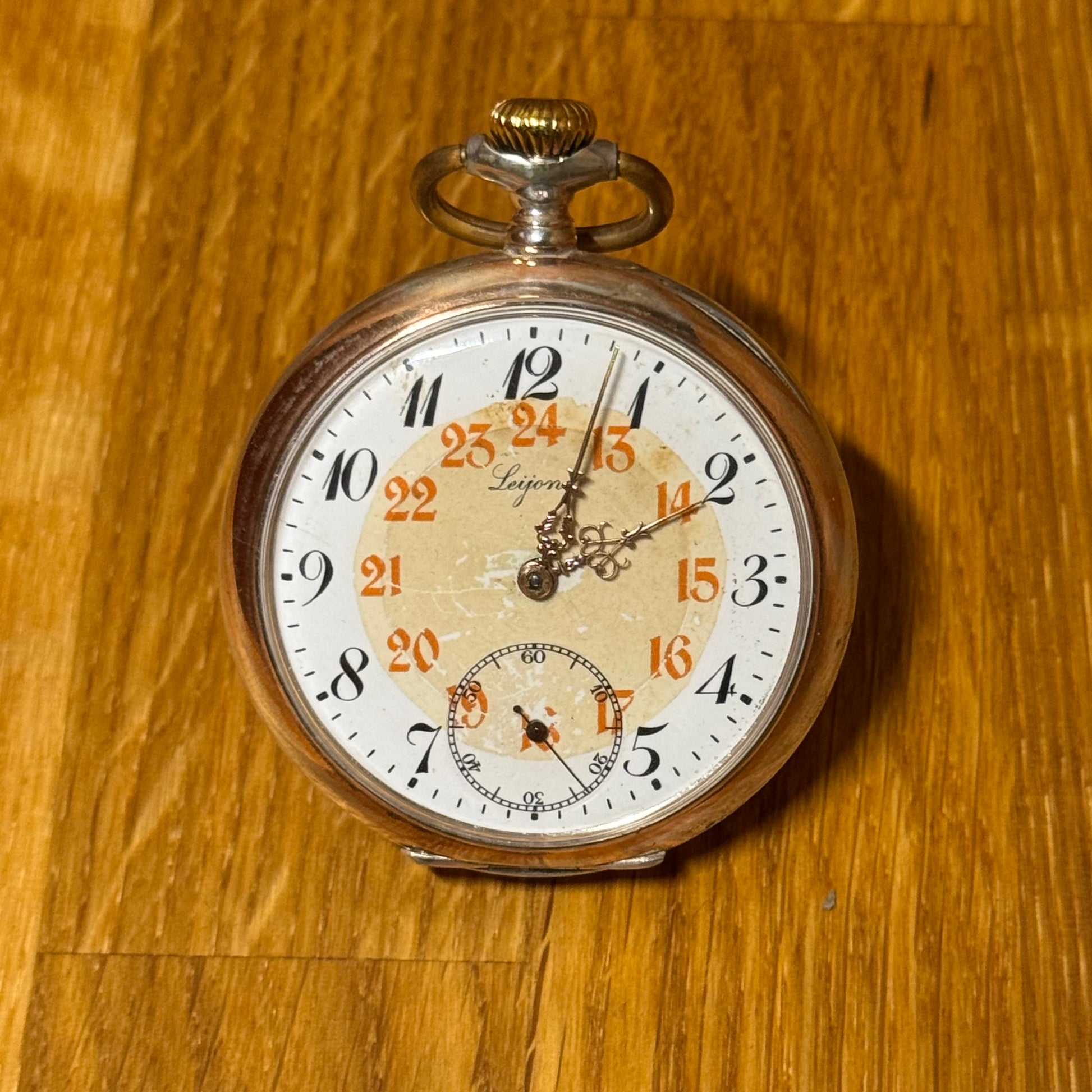 Manuaalivetoinen taskukello 1930-luvulta. Kellossa on valkoinen kellotaulu ja hopeiset kuoret roseekullatuin reunoin. Kuoren kultauksessa ja kellotaulussa on kulumaa.