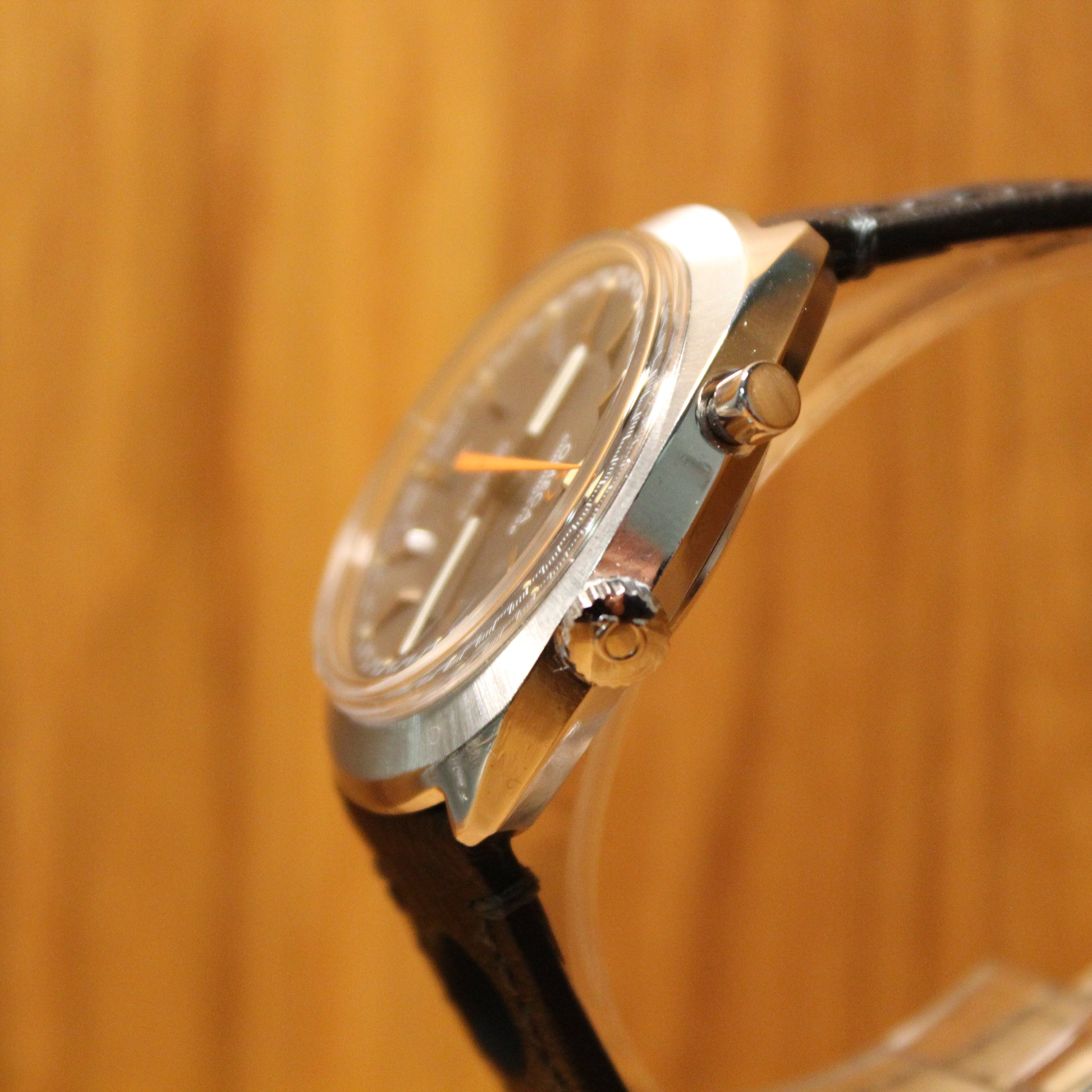 Teräskuorinen kello harmaalla convex-taululla ja oranssilla sekuntilaskurilla. Rannekkeena kellossa on uusi musta Hirsch Rally nahkaranneke. Kello on huollettu valtuutetussa Omega-huollossa alkuperäisin osin ja kellolle myönnetään kahden vuoden takuu. Kello toimitetaan Omegan huoltorasiassa.
