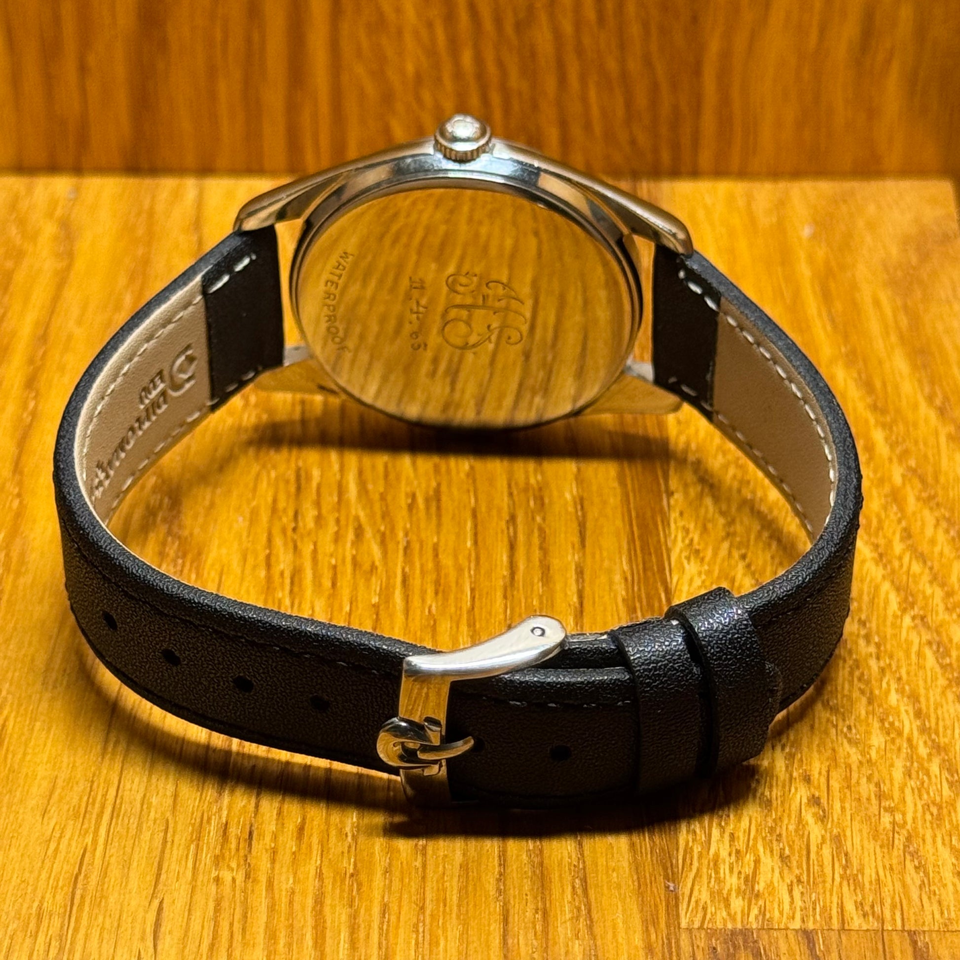 Teräskuorinen kello. Alkuperäinen lasike ja nuppi. Kellon kuoressa ja lasikkeessa vähäisiä käytön jälkiä. Takapohjassa kaiverrus. Musta nahkaranneke alkuperäisellä soljella.