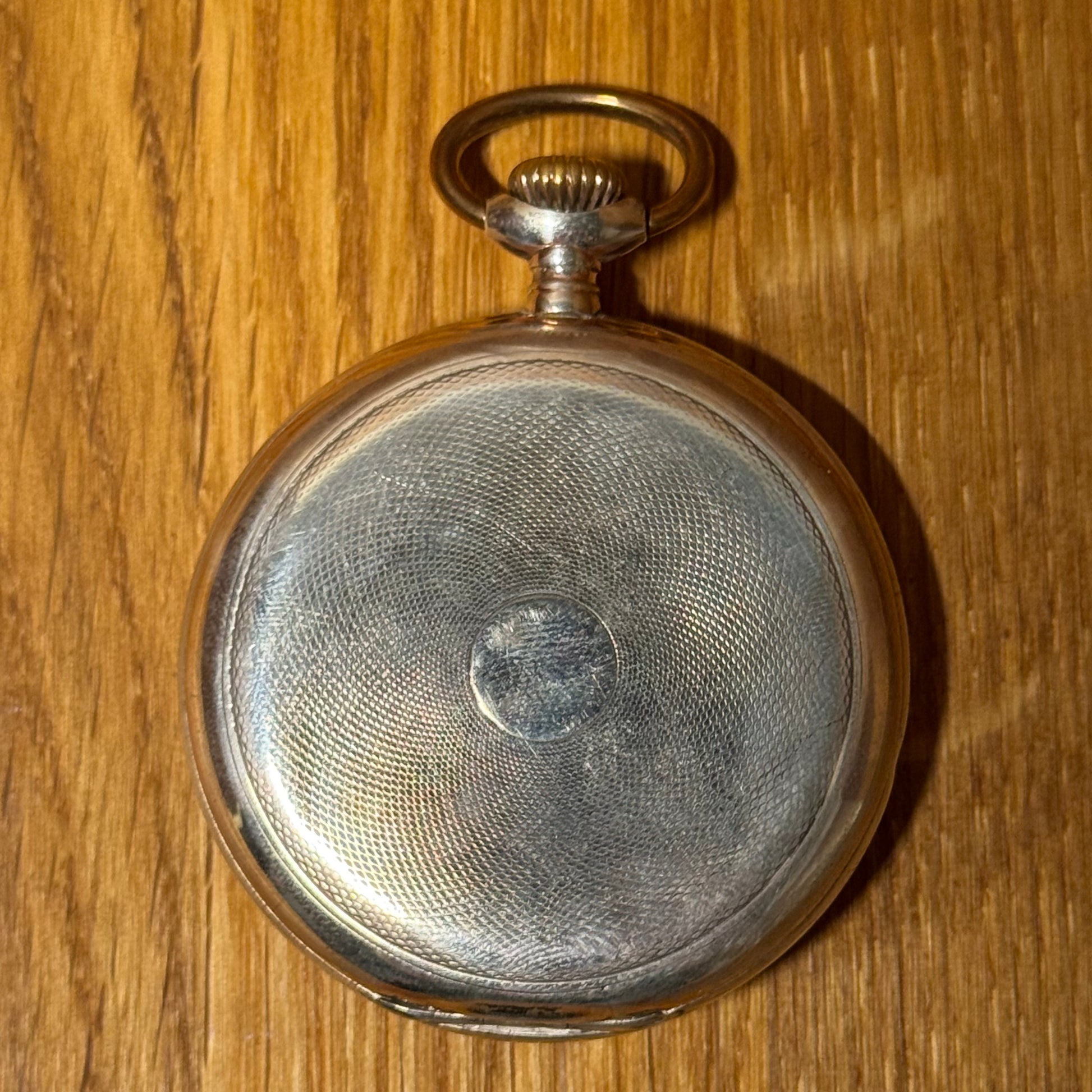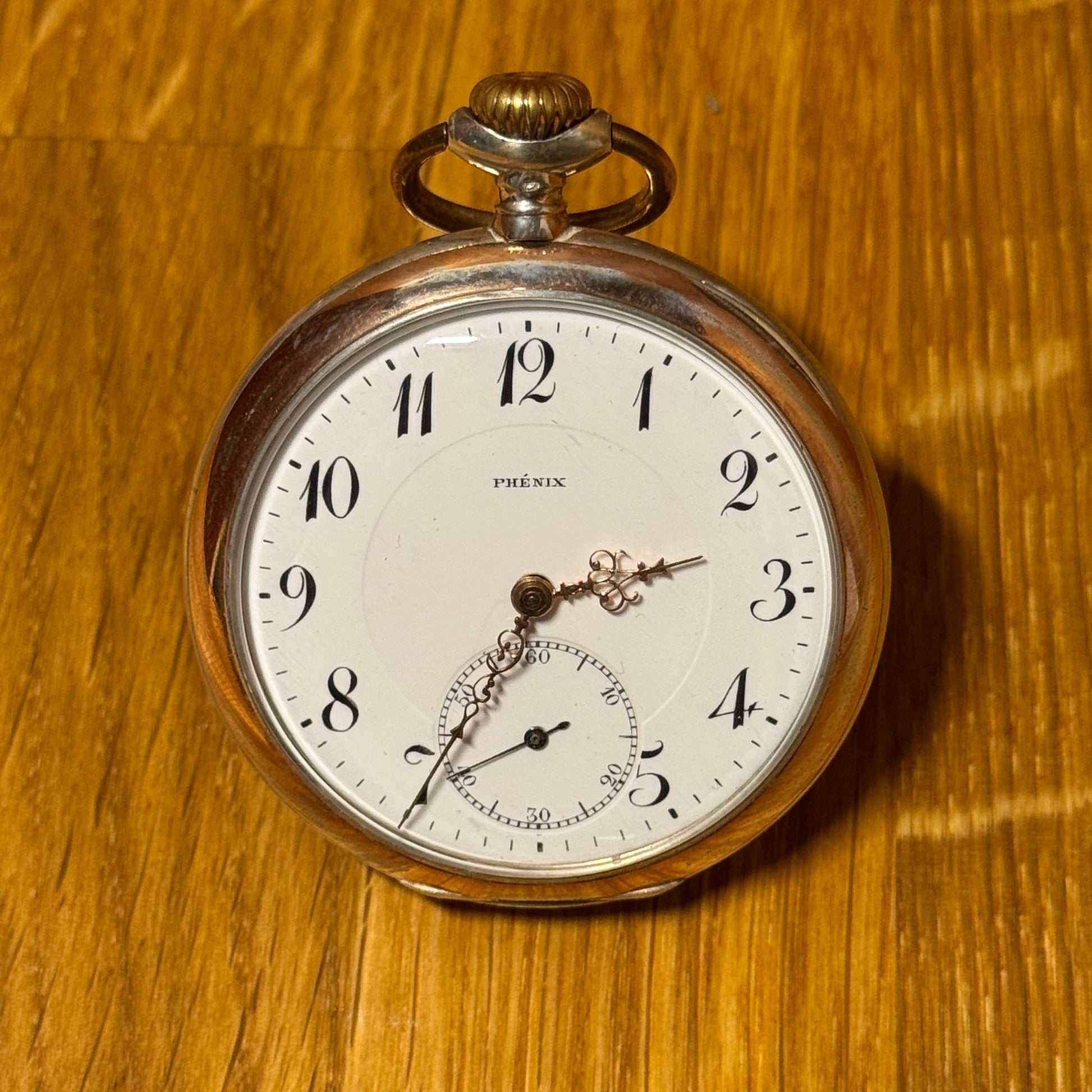 Phénix taskukello 1920-luvulta. Kellossa on hopeiset kuoret ja valkoinen taulu. Kellon koneisto on manuaalivetoinen Brevet nro 51828